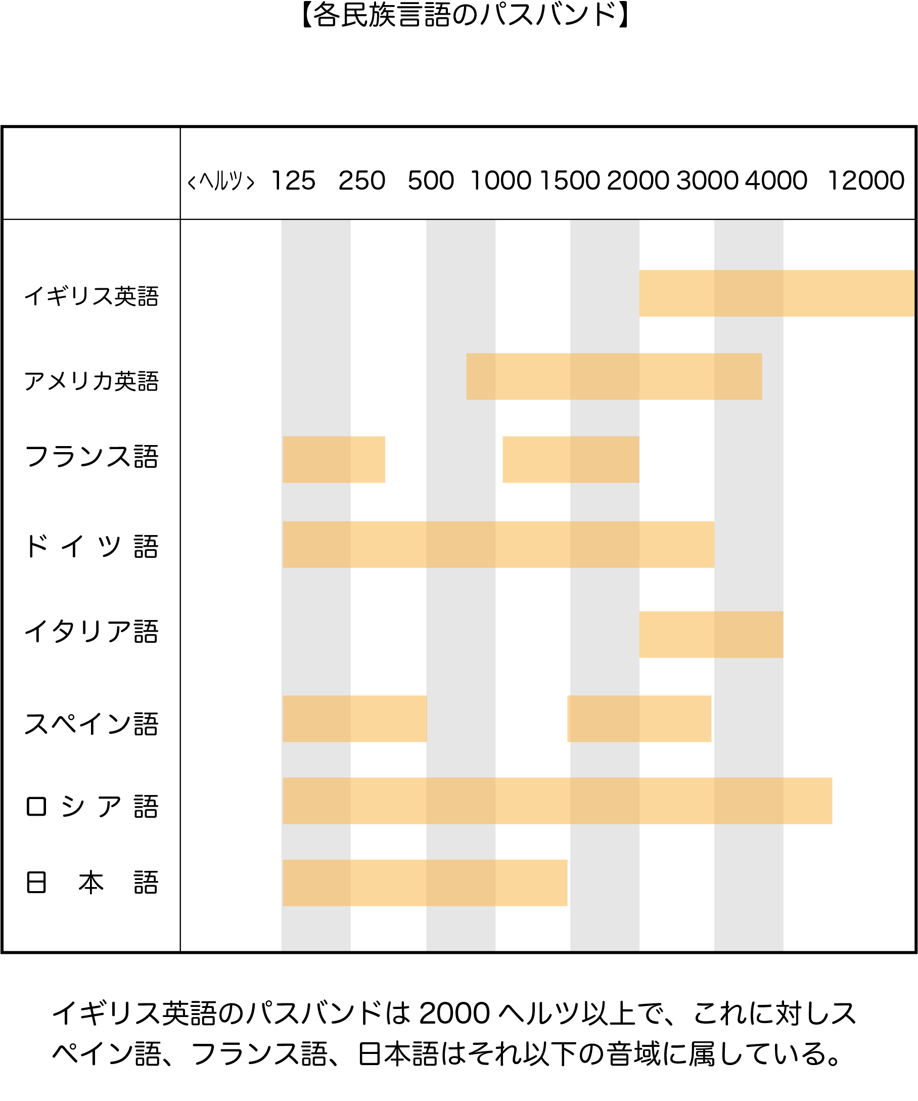 なぜ、私たちはドイツ語をこれほどまでに聴き取りにくいと感じるのでしょうか。その答えは、言語ごとに存在する「優先周波数帯(パスバンド)」の違いにあります。